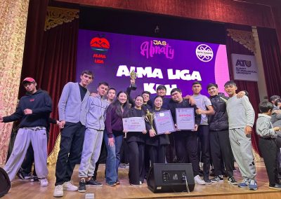On November 30, the final stage of the ALMA LIGA KVN League in Almaty was held with the support of the Youth Policy Department of Almaty. The teams «KyzdarMAN» and «Logistics» from the Jaidarman ALT University club passed the qualifying rounds and reached the final stage, where they performed with distinction. The game consisted of Russian-language competitions called «Приветсвие» and «Разминка». As a result, the «KyzdarMAN» team was awarded second place, while the «Logistics» team received third place. Cash prizes of 150,000 and 100,000 tenge were also awarded.