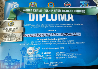 We sincerely congratulate Baimukhanbetov Bakytbek Kuandykuly, a staff member of the Department of Social and Humanitarian Disciplines and Physical Culture of M. Tynyshpaev ALT University, on his brilliant achievement — winning IIst place at the WORLD CUP FINAL – 2025 in hand-to-hand combat among veterans!