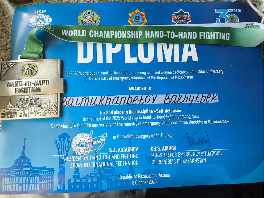 We sincerely congratulate Baimukhanbetov Bakytbek Kuandykuly, a staff member of the Department of Social and Humanitarian Disciplines and Physical Culture of M. Tynyshpaev ALT University, on his brilliant achievement — winning IIst place at the WORLD CUP FINAL – 2025 in hand-to-hand combat among veterans!