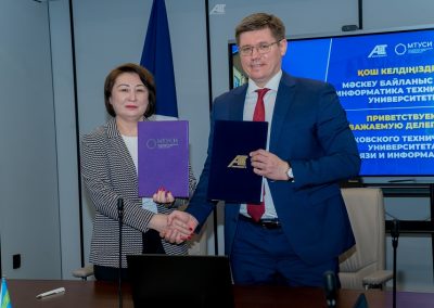 The meeting opened with welcoming speeches from the heads of the universities: Meruert Zharmagambetova, Chair of the Board-Rector of ALT University, and Sergey Erokhin, Rector of MTUCI. The delegations included vice-rectors and leading experts in digital technologies and telecommunications from both sides.