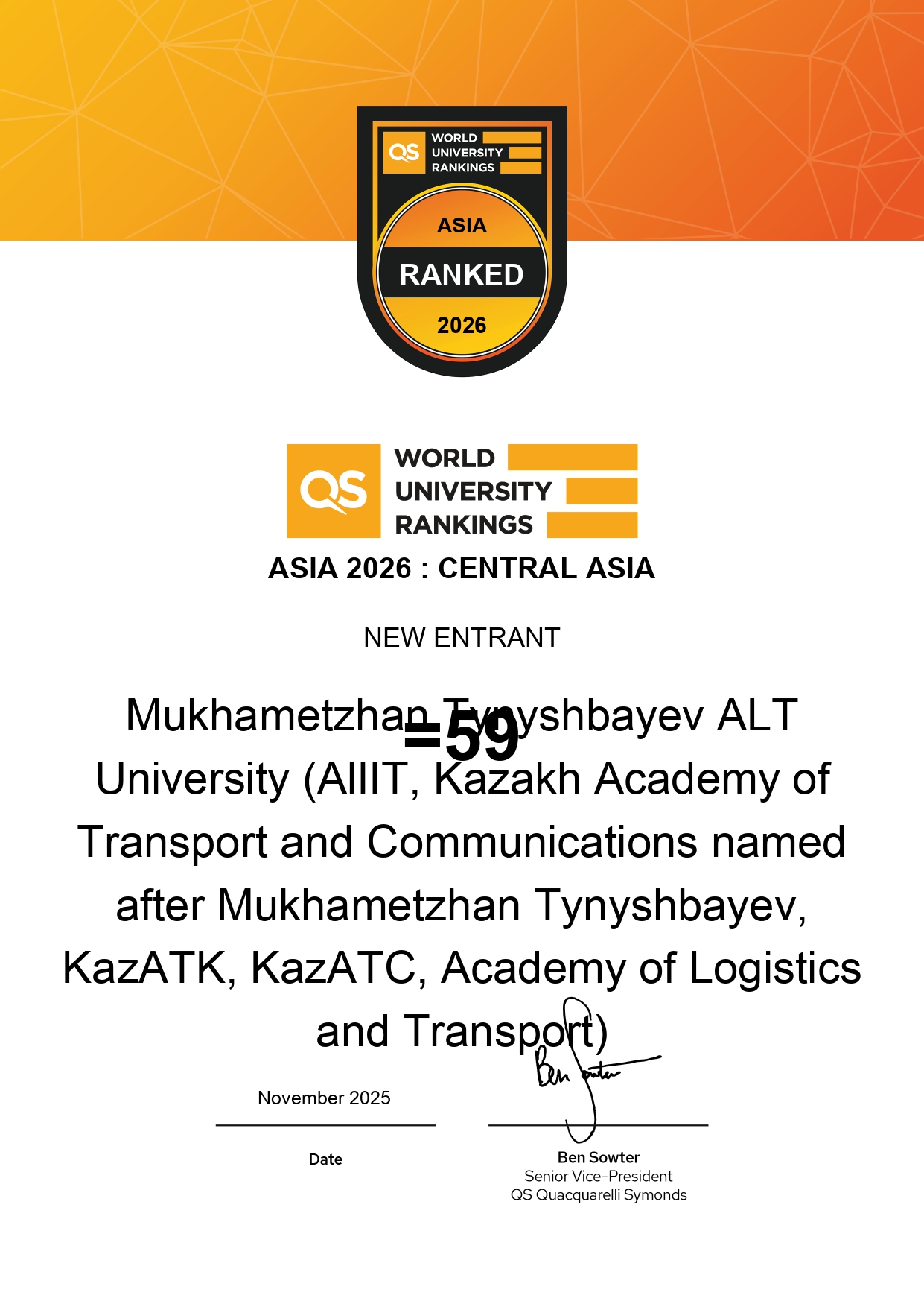 Mukhametzhan Tynyshbayev ALT University has entered the prestigious QS World University Rankings: Asia 2026 for the first time, achieving a position in the 1001–1100 band in Asia and ranking 59th among universities in Central Asia.