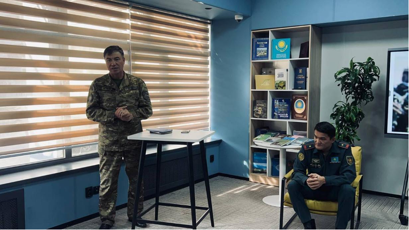 On November 25, 2025, in accordance with the plan and schedule of classes of the Institute of Military Affairs, a representative of the military communications bodies, the head of the Almaty military communications department, Major Berikkulov Kuangali Kudirkulovich. Delivered a guest lecture on the topic: “Transshipment areas at junction points of railways of different gauge.”