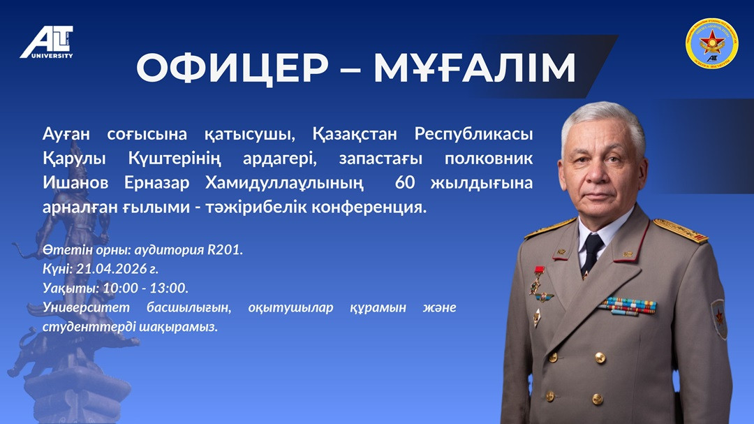 Сіздерді Ауған соғысының ардагері, ҚР Қарулы Күштерінің ардагері, отставкадағы полковник Ерназар Хамидуллаұлы Ишановтың 60 жылдық мерейтойына арналған ғылыми-практикалық конференцияға қатысуға шақырамыз.