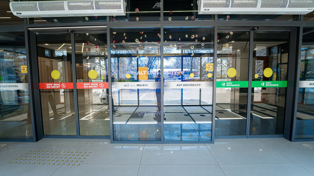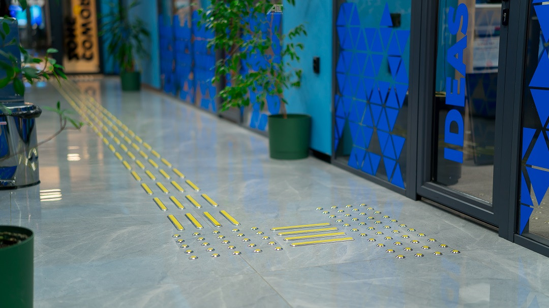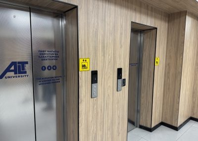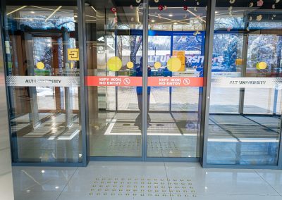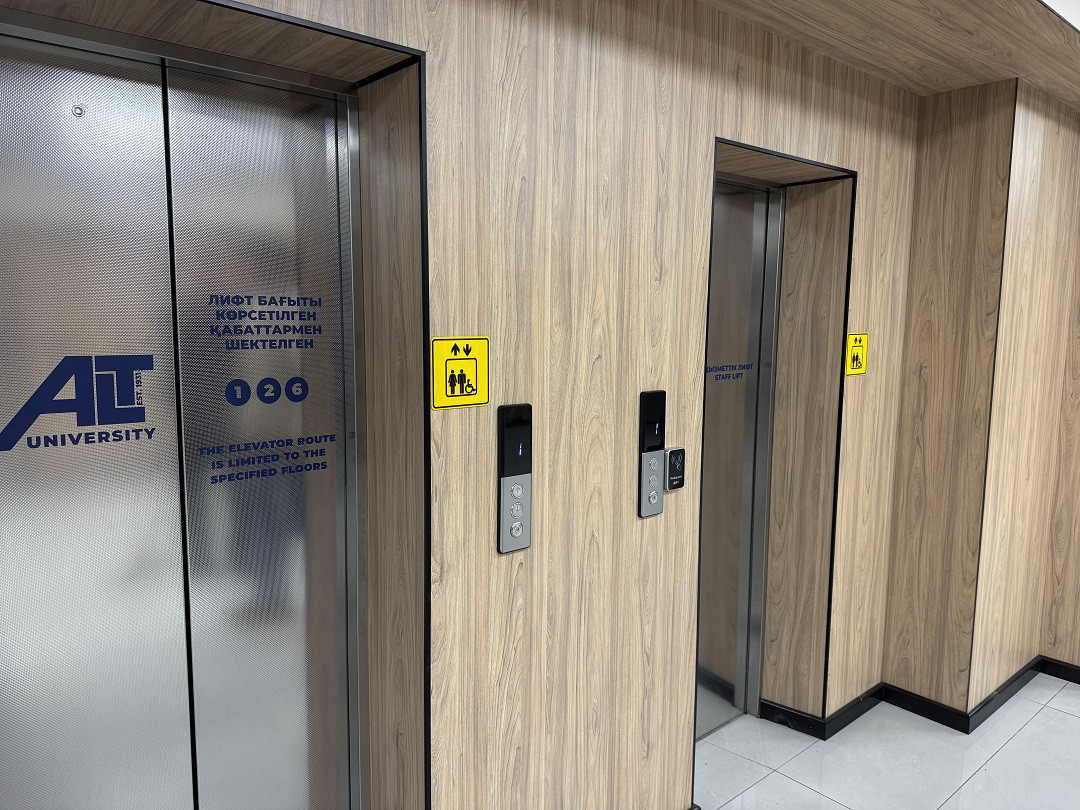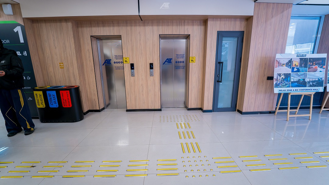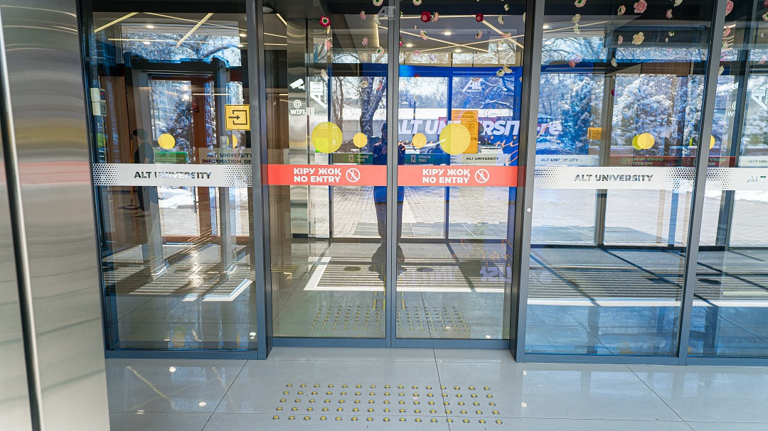 Кабинетте және санитариялық тораптарда Брайль қарпі бар көрсеткіш тақтайшалар орнатылған. «ALT Университет» АҚ корпусына кірер алдында сары түсті тану белгілері және еден деңгейінен 0,9 м.бастап 1,2 м. дейінгі биіктікте шақыру түймесі орнатылған және қауіпсіздік қызметімен нұсқау берілген, олар ғимаратқа кіру үшін қоңырауға дереу жауап береді.