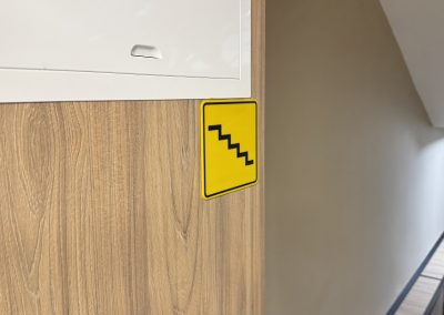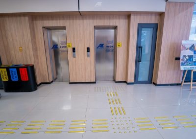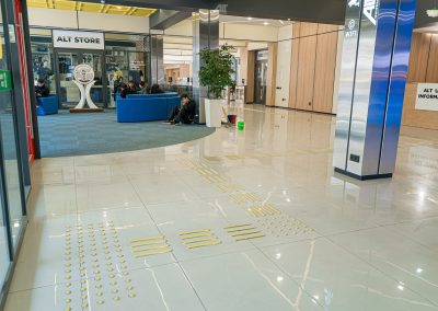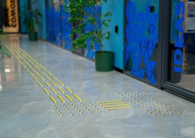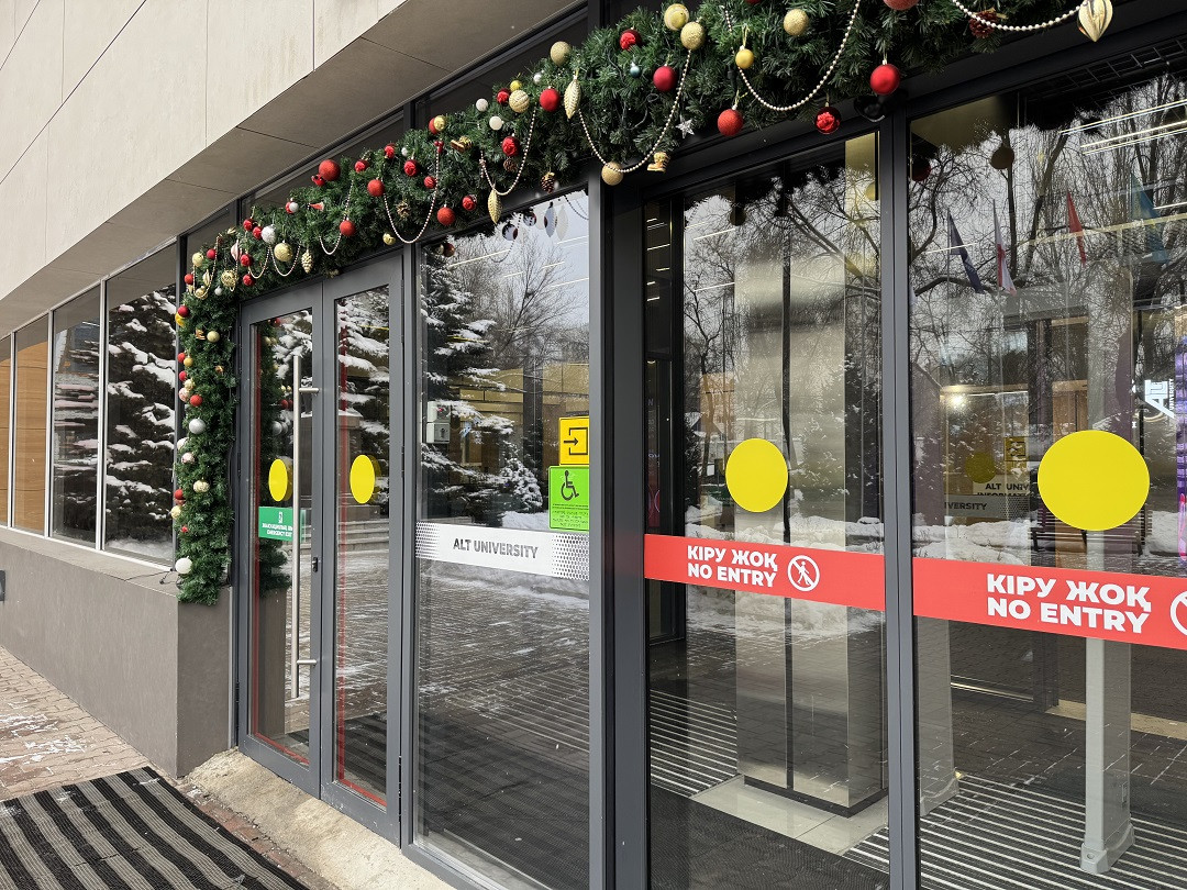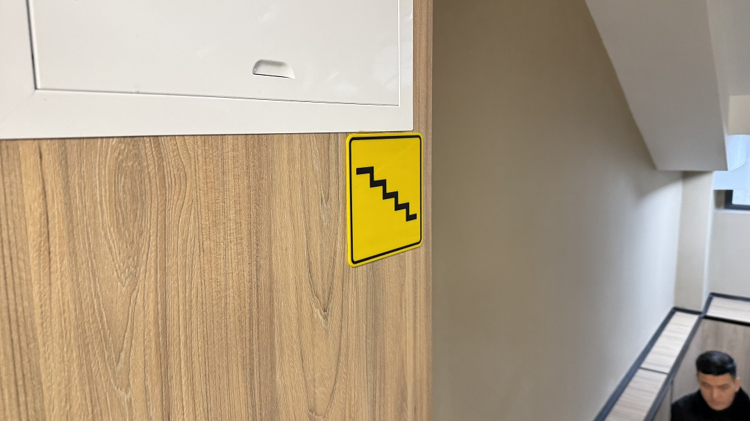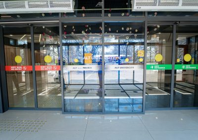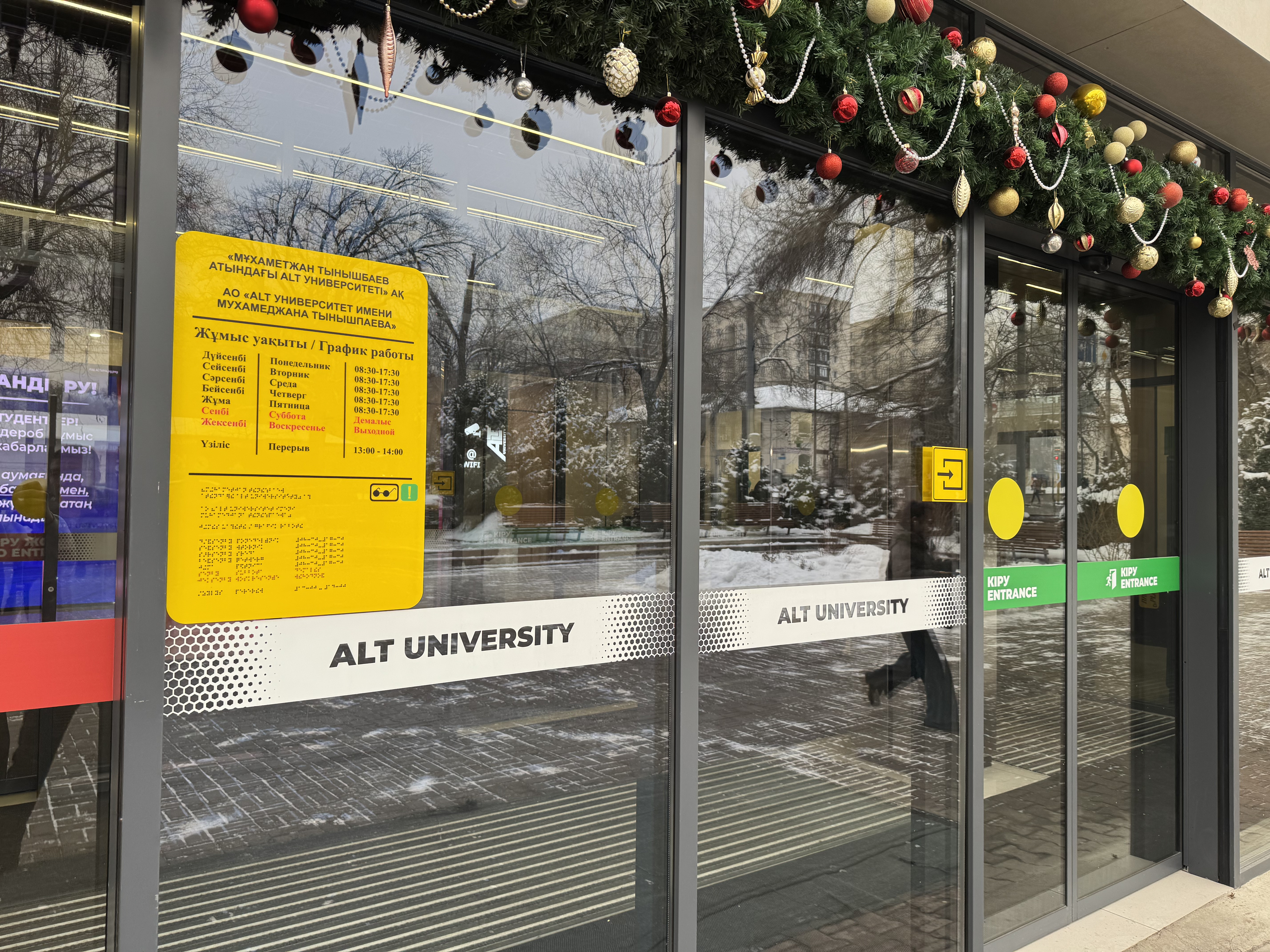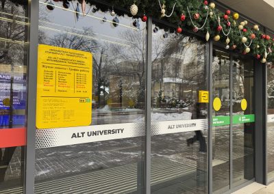 Кабинетте және санитариялық тораптарда Брайль қарпі бар көрсеткіш тақтайшалар орнатылған. «ALT Университет» АҚ корпусына кірер алдында сары түсті тану белгілері және еден деңгейінен 0,9 м.бастап 1,2 м. дейінгі биіктікте шақыру түймесі орнатылған және қауіпсіздік қызметімен нұсқау берілген, олар ғимаратқа кіру үшін қоңырауға дереу жауап береді.