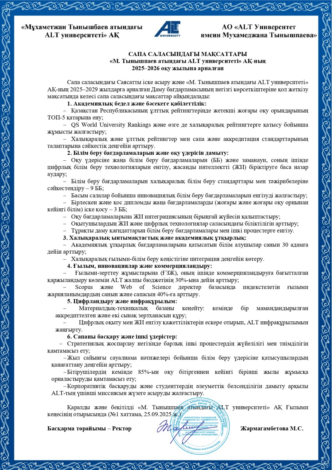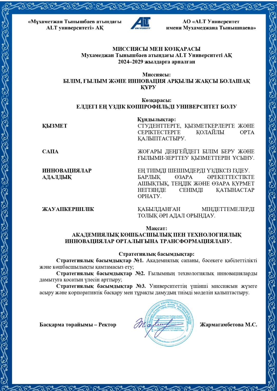 Миссиясы және пайымдауы file pdf icon Операционный план file pdf icon Программа развития АО «ALT Университет имени Мухамеджана Тынышпаева» на 2024-2029 годы file pdf icon «М. Тынышбаев атындағы ALT Университет» АҚ жасанды интеллектіні енгізу стратегиясы