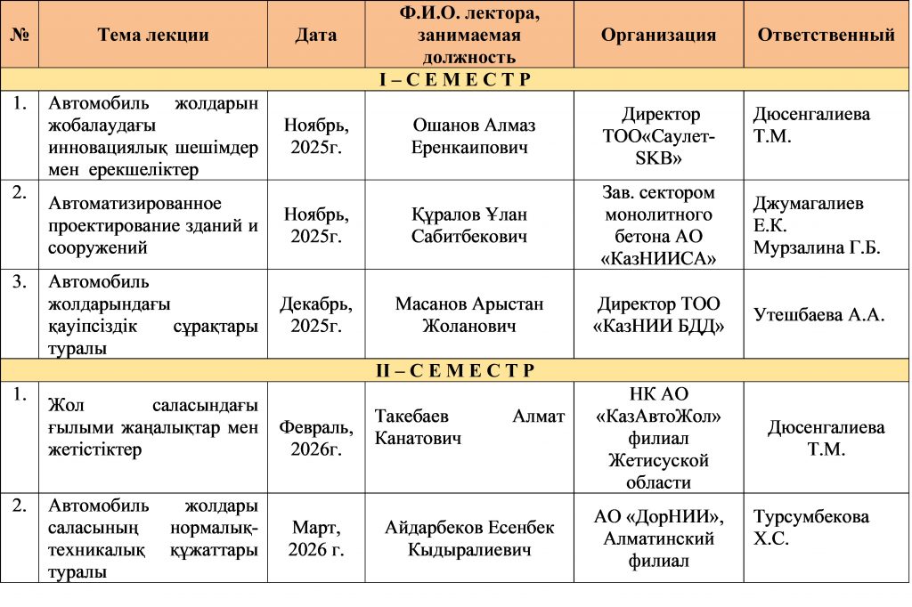 Для закрепления теоретических и практических навыков у обучающихся образовательных программ 6В07130 ‒ «Автомобильные дороги и аэродромы» (АДА), 6В07324 ‒ «Строительство автомобильных дорог и аэродромов» (САДА), 6В07348 – Строительство автомобильных дорог и аэродромов (САДА) по профилирующим дисциплинам на базе РГП на ПХВ «Национальный Центр Качества Дорожных Активов (НЦКДА)» Алматинского филиала созданы и функционируют филиалы кафедры «Архитектурно-строительная инженерия». На базе филиалов проводятся практические занятия в реальных производственных условиях, а также ознакомительные экскурсии для студентов младших курсов.