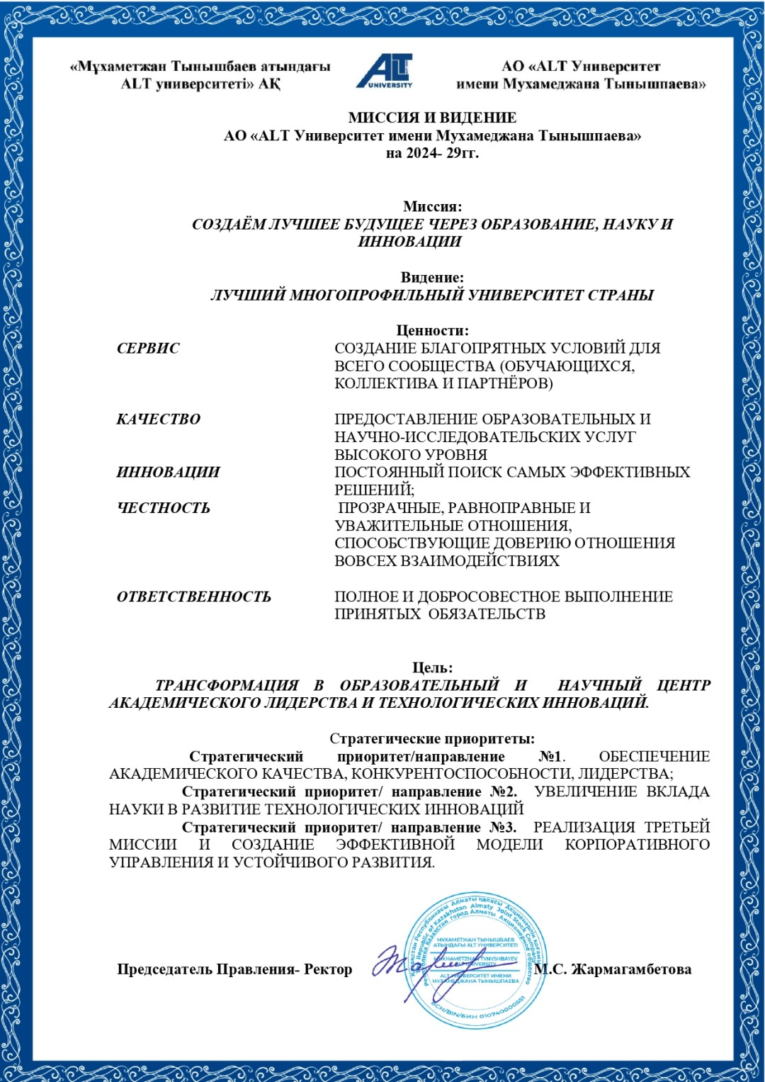 Миссия и стратегия file pdf icon ОПЕРАЦИОННЫЙ ПЛАН на 2025-2026 учебный год file pdf icon Программа развития АО «ALT Университет имени Мухамеджана Тынышпаева» на 2024-2029 годы file pdf icon Стратегия внедрения искусственного интеллекта в АО «ALT Университет имени М. Тынышпаева»