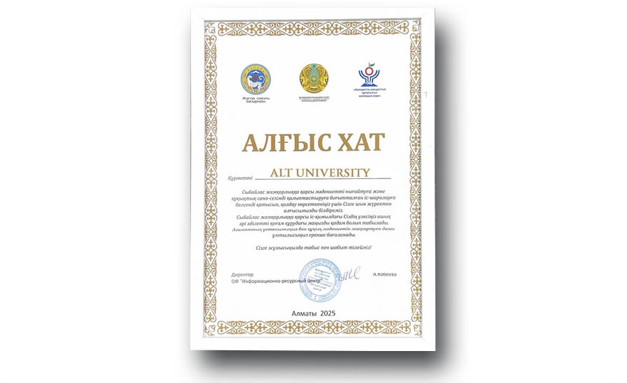 ALT UNIVERSITY удостоен благодарственного письма от Общественного фонда «Информационно-ресурсный центр» при поддержке Управления по вопросам молодежной политики и Департамента Агентства по делам государственной службы РК по г. Алматы.