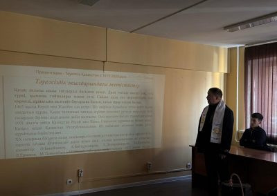 С презентационным докладом выступил заведующий кафедрой транспортного строительства, ассоциированный профессор ALT Тулемисов Т.Ж. В своем докладе он изложил краткую историю развития и основные достижения Независимого Казахстана за 1991-2025 годы.