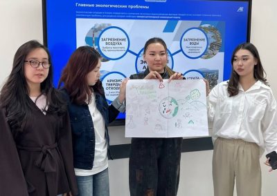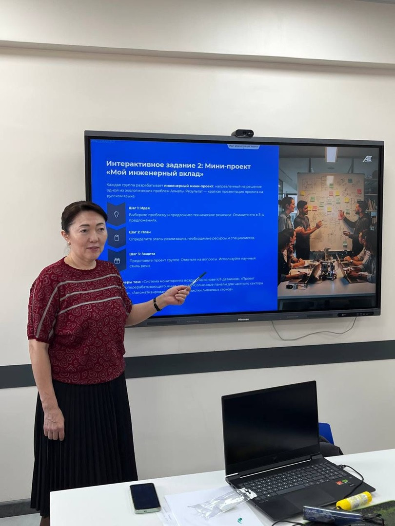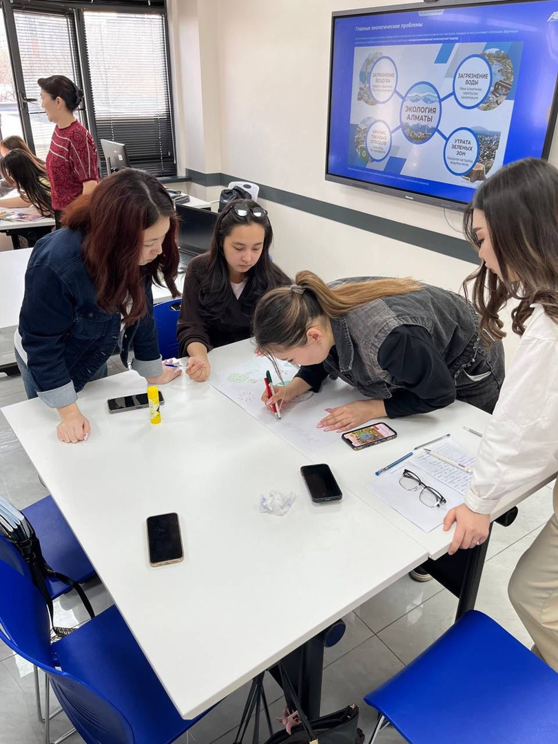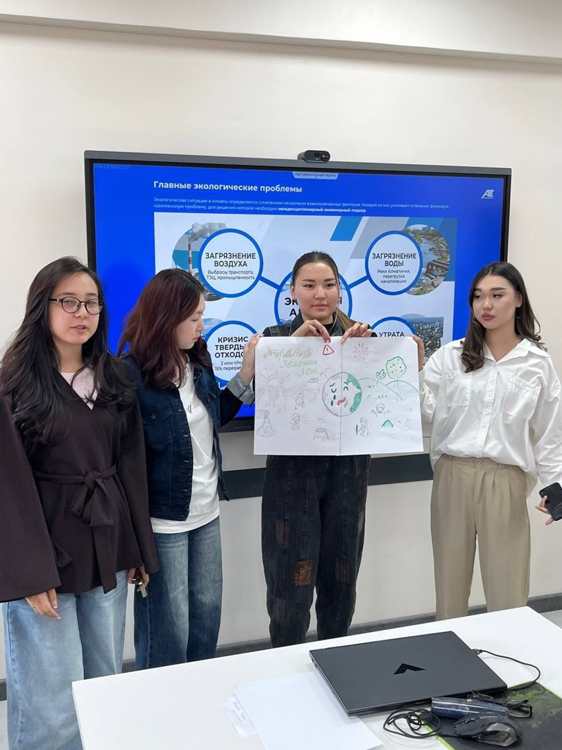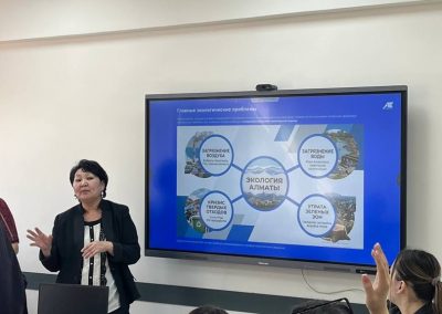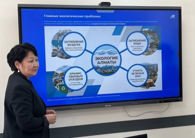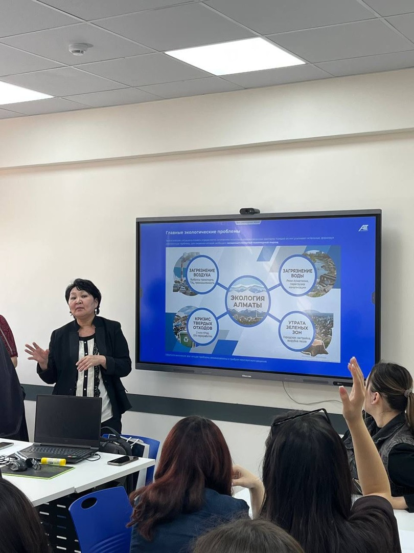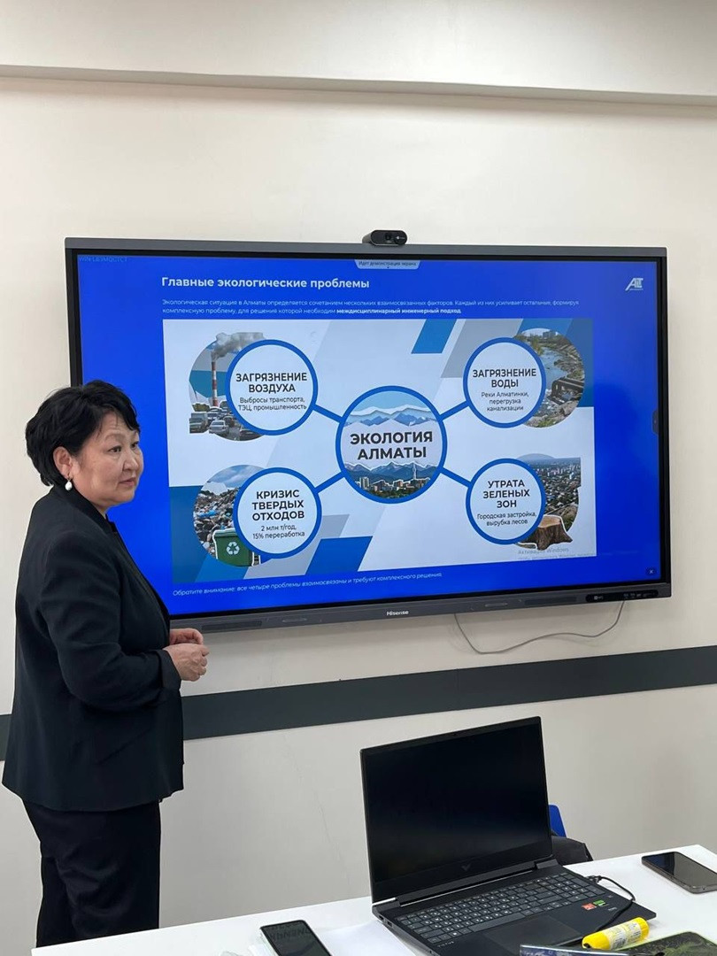 В ходе встречи обучающиеся ознакомились с острыми экологическими проблемами города Алматы, включая загрязнение воздуха и водных ресурсов, кризис управления твердыми бытовыми отходами и сокращение зеленых насаждений. Особый акцент был сделан на необходимости междисциплинарного подхода к решению этих проблем и их глубокой взаимосвязи.