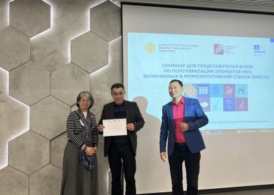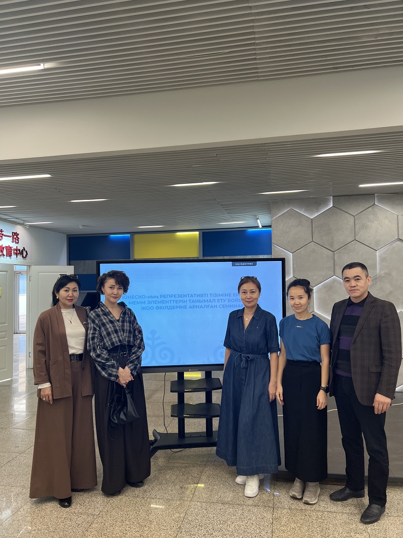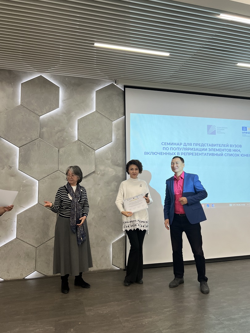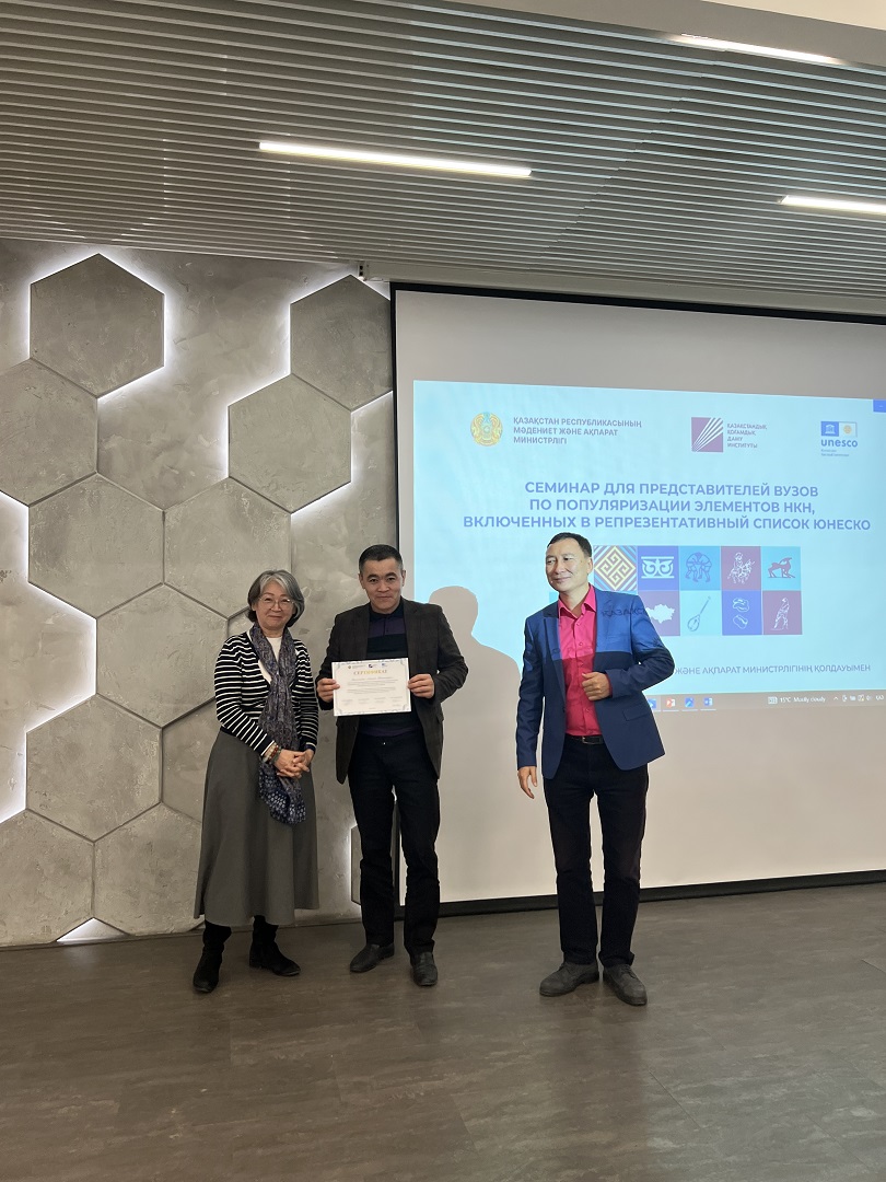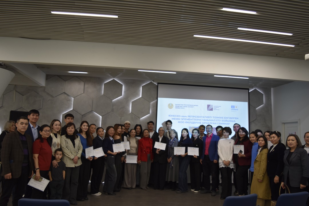 29-30 октября 2025 г. ППС кафедры проф. Абдирайымова А.С., ассоц.проф. Курманбаева Л.Т., сениор-лектор Канагатов М.К., сениор-лектор Бейсенова П.М. приняли участие на семинаре по популяризации элементов нематериального культурного наследия человечества, включенных в Репрезентативный список ЮНЕСКО, среди представителей вузов и студентов Казахстана, а также стимулирование их активного участия в сохранении и дальнейшем их развитии. Мероприятие прошло под руководством Министерства культуры и информации РК, НАО «Казахстанский институт общественного развития».