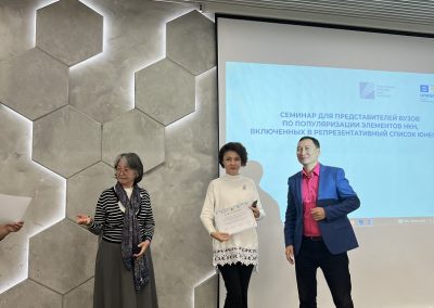 Семинар был направлен на повышение уровня осведомленности представителей вузов Казахстана о концепции НКН и об участии Казахстана в международных инициативах ЮНЕСКО, связанных с сохранением НКН; Ознакомление участников с национальной системой учета элементов НКН, процессом формирования Национального перечня и Репрезентативного списка ЮНЕСКО, а также с международными критериями номинации;