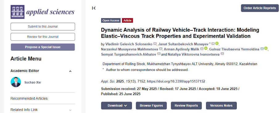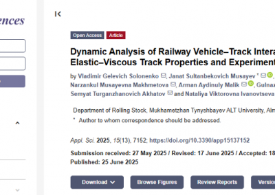 Solonenko V.G., Musayev J.S., Makhmetova N.M., Malik A.A., Yermoldina G.T., Akhatov S.T., Ivanovtseva N.V. Dynamic Analysis of Railway Vehicle–Track Interaction: Modeling Elastic–Viscous Track Properties and Experimental Validation // Applied Sciences. – 2025. – Т. 15. – №. 13. – Р. 7152.