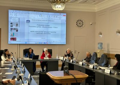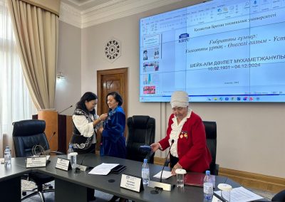 В ходе открытого обмена мнениями слово было предоставлено преподавателям КБТУ: Исмаилов Абдуллахат Абдикаримович, доктор технических наук, подчеркнул, что в период работы с профессором Даулетом Мухамеджановичем он был сильным специалистом и ученым в нефтяной отрасли. Умаров Фарид Факреевич рассказал о вопросе доктора технических наук, профессора Даулета Мухамеджановича о Ташкенте и достижениях его сына Аскара Даулетулы в период руководства кафедрой. Доктор технических наук, профессор Даулет Мухамеджанович Валерий Васильевич Коробкин высоко оценил выдающийся труд сына первого инженера казаха Мухамеджана Тынышбаева на строительстве Турксибской железной дороги, отметив, что познакомился с творчеством этого человека еще в 60-х годах. В ходе круглого стола был показан фильм «Проект века» о М. Тынышбаеве. В завершение вечера руководитель Фонда М. Тынышбаева Нуршакен Апай вручила Салтанат Нурадилыкызыне медаль «М. Тынышбаева».