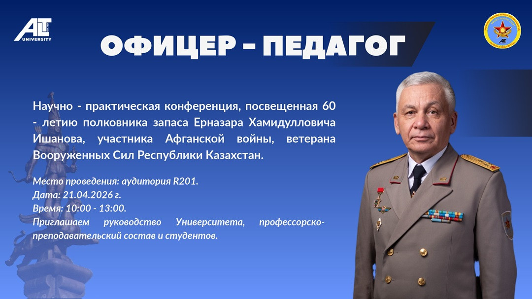 Приглашаем вас принять участие в научно-практической конференции, посвященной 60-летнему юбилею выдающейся личности, защитника Отечества и наставника — полковника запаса Ерназара Хамидулловича Ишанова.