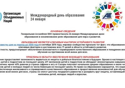 Жыл сайын 24 қаңтарда әлемдік қоғамдастық БҰҰ Бас Ассамблеясы жариялаған Халықаралық білім күнін атап өтеді. Бұл күн білім берудің бейбітшілікті, әлеуметтік прогресті және тұрақты дамуды қамтамасыз етудегі шешуші рөлін айқындайды.