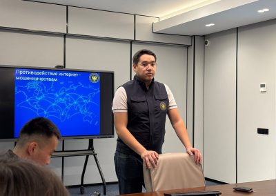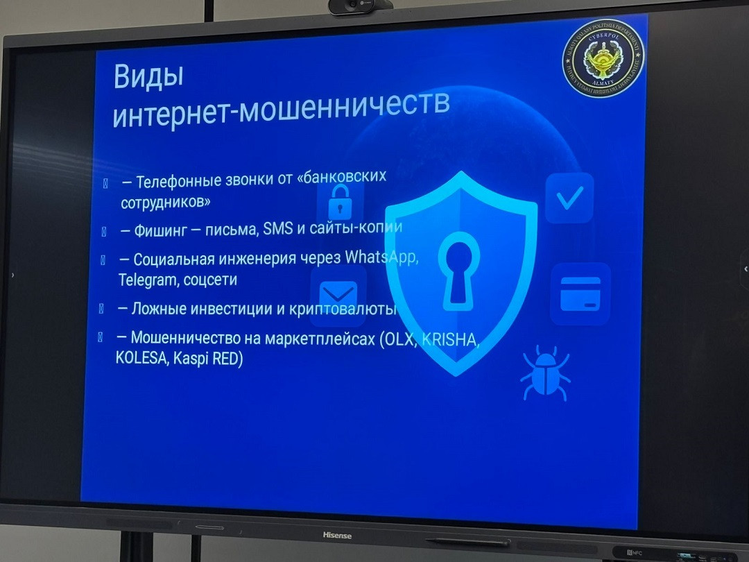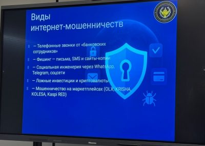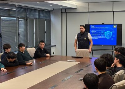 Кездесу барысында киберқылмыстың өзекті түрлері, интернет-алаяқтық, жеке деректерді қорғау, әлеуметтік желілер мен онлайн платформаларда қауіпсіздік сақтау мәселелері кеңінен қозғалды. Спикер нақты мысалдар арқылы киберқауіптердің алдын алу жолдарын түсіндіріп, студенттерге практикалық кеңестер берді. Студенттер цифрлық ортада кездесетін тәуекелдерге қатысты жан-жақты жауап алды.