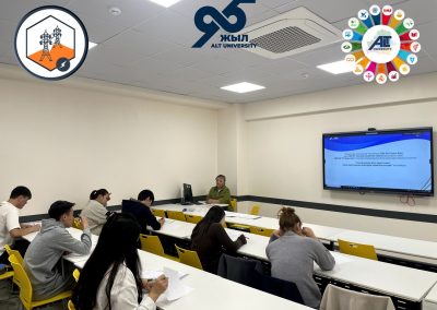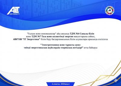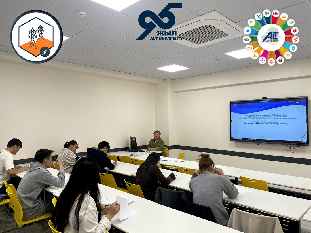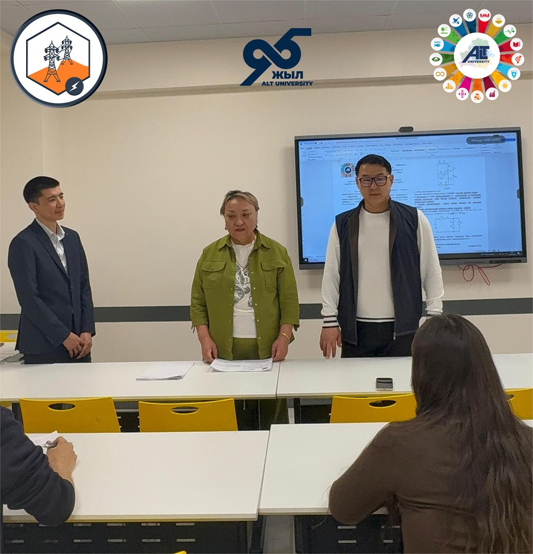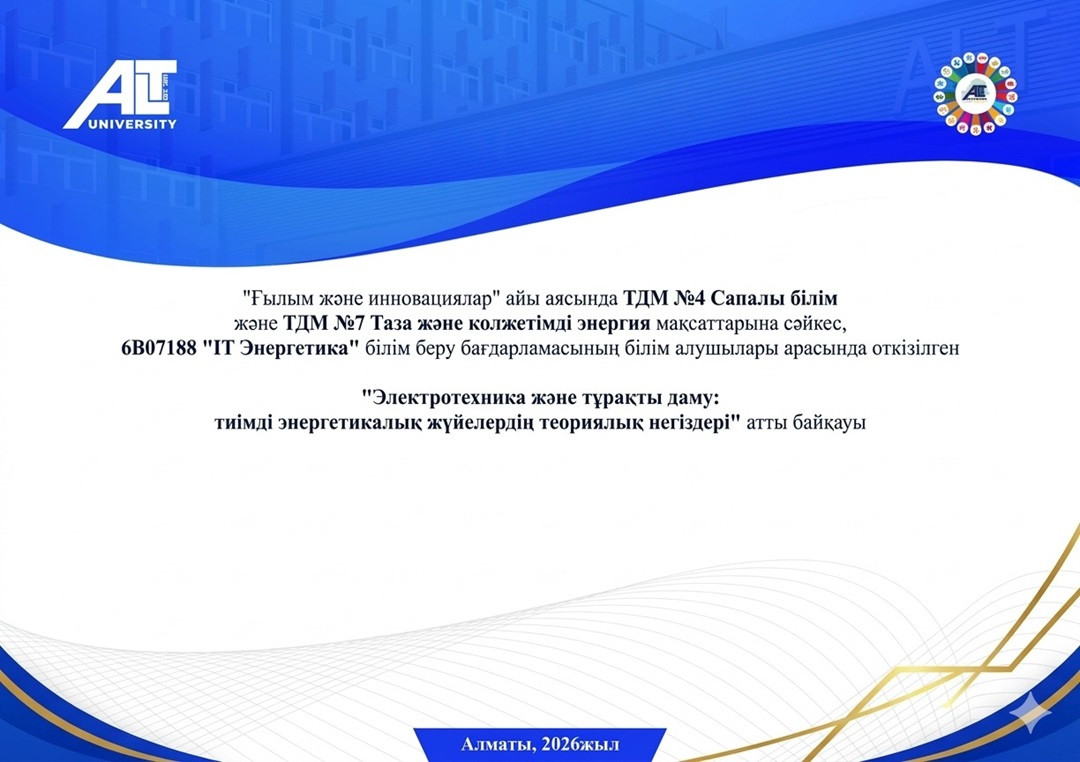 ALT Университетінде электротехника саласының маңыздылығын арттыру және студенттердің ғылыми-теориялық білімдерін дамыту мақсатында ағымдағы жылдың 9 сәуір күні «Ғылым және инновациялар» айы аясында, ТДМ №4 «Сапалы білім» және ТДМ №7 «Таза және қолжетімді энергия» мақсаттарына сәйкес 6В07188 «IT Энергетика» білім беру бағдарламасының 2 курс білім алушылары арасында «Электротехника және тұрақты даму: тиімді энергетикалық жүйелердің теориялық негіздері» атты байқау өткізілді.