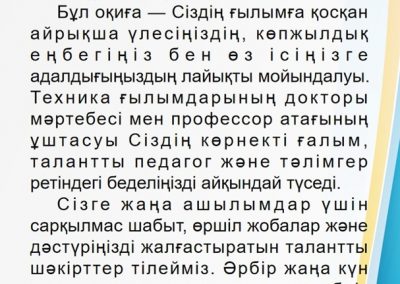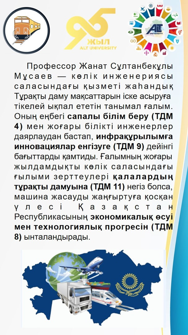 Техника ғылымдарының докторы мәртебесі мен профессор атағының ұштасуы — Сіздің көрнекті ғалым, талантты педагог және нағыз тәлімгер ретіндегі беделіңіздің айқын дәлелі. Сіздің көлік инженериясы саласындағы қызметіңіз жаһандық Тұрақты даму мақсаттарын іске асыруға тікелей ықпал етеді: