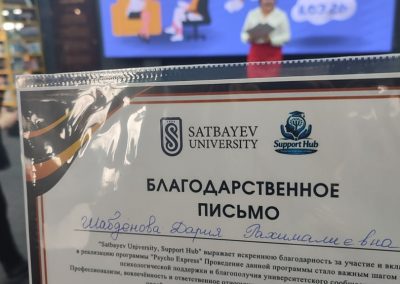 Іс-шара барысында университет студенттері мен қызметкерлеріне психологиялық көмек көрсетілді. Қатысу қорытындысы бойынша Шабденова Дария Рахималиевна университеттер арасындағы психологиялық қолдау саласындағы ынтымақтастықты дамытуға және студент жастардың менталдық денсаулығын нығайтуға қосқан үлесі үшін Серік Қасымұлы Шалабаев, Satbayev University әкімшілік, әлеуметтік және тәрбие жұмыстары жөніндегі проректорының алғыс хатымен марапатталды.
