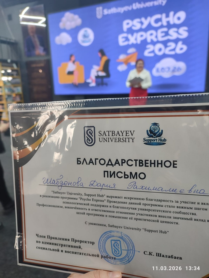 2026 жылғы 11 наурызда Инклюзивті білім беру және менталдық денсаулық офисінің жетекшісі Шабденова Дария Рахималиевна психолог-консультант ретінде Satbayev University – Қ.И. Сәтбаев атындағы Қазақ ұлттық техникалық зерттеу университеті (Алматы қ.) базасында өткен «Psycho Express – Support Hub: психологиялық қолдау моделі» атты жоғары оқу орындары арасындағы іс-шараға қатысты.