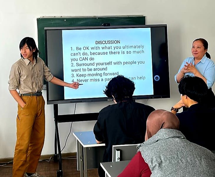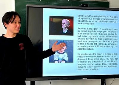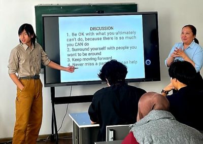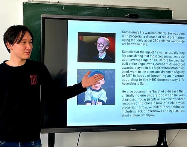 Осы мақсатты жүзеге асыру аясында сабақ құрылымы инклюзивті білім беру қағидаттарына негізделді. Сабақтың негізгі тапсырмасы мүмкіндігі шектеулі адам туралы бейнематериалды (YouTube дереккөзі: «My philosophy for a happy life – Sam Berns») көру және талқылау болды. Бұл тілдік дағдыларды дамыту мен теңдік, төзімділік және әлеуметтік жауапкершілік құндылықтарын қалыптастыруды үйлестіруге мүмкіндік берді. Таңдалған материал инклюзия және барлық білім алушылар үшін тең білім беру мүмкіндіктері идеяларын тікелей көрсетеді, бұл ТДМ 4-тің негізгі аспектісі болып табылады.