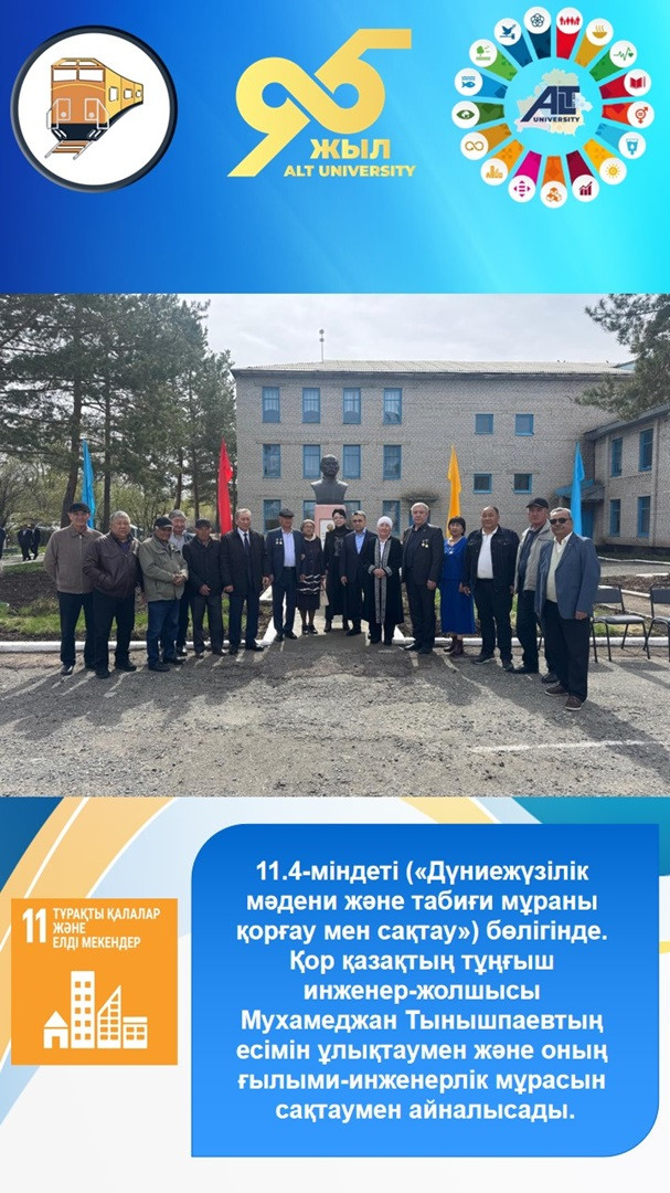 - 11-ТДМ: Тұрақты қалалар мен елді мекендер— 11.4-міндеті («Дүниежүзілік мәдени және табиғи мұраны қорғау мен сақтау») бөлігінде. Қор қазақтың тұңғыш инженер-жолшысы Мухамеджан Тынышпаевтың есімін ұлықтаумен және оның ғылыми-инженерлік мұрасын сақтаумен айналысады.