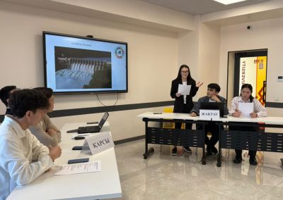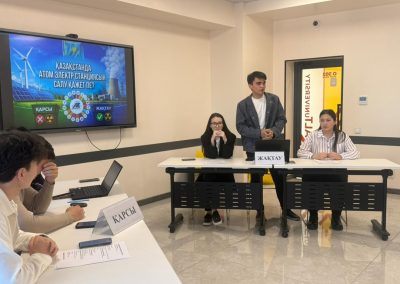Дебат барысында студенттер екі топқа бөлініп, атом электр станциясын салудың тиімді және тиімсіз жақтарын жан-жақты талқылады. Олар экологиялық қауіпсіздік, экономикалық тиімділік, энергия тапшылығы, заманауи технологиялар мен халықтың пікірін ескеру сияқты маңызды аспектілерді қарастырды. Әр топ өз ұстанымдарын нақты дәлелдермен негіздеп, қарсы тараптың аргументтеріне жауап беруге тырысты.